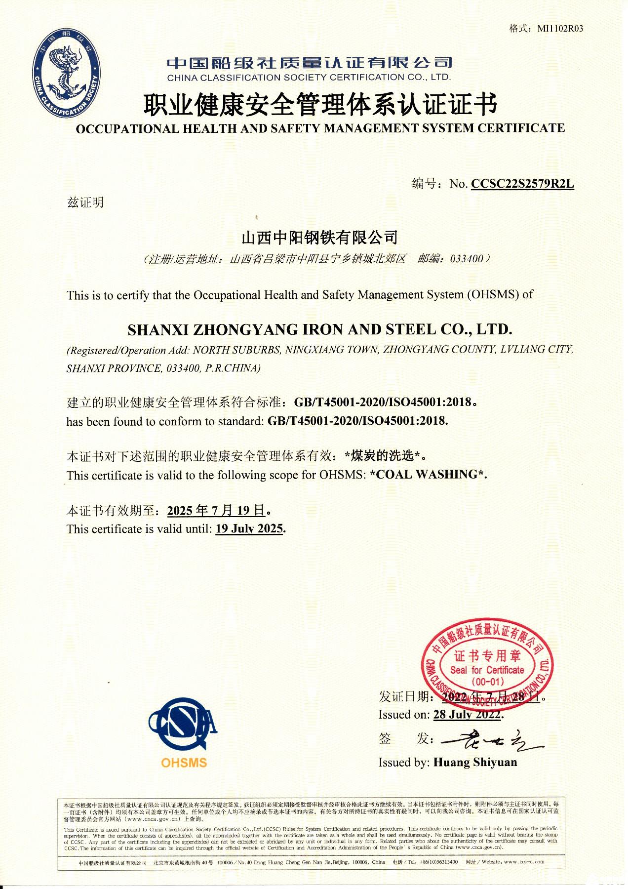 職業(yè)健康安全管理體系認(rèn)證證書(煤炭洗選)