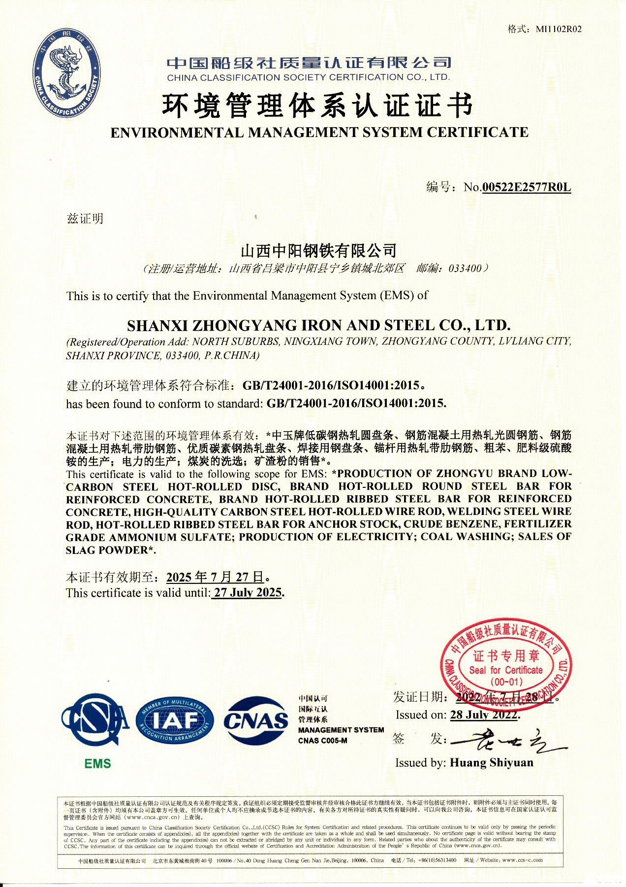 環(huán)境管理體系認(rèn)證證書