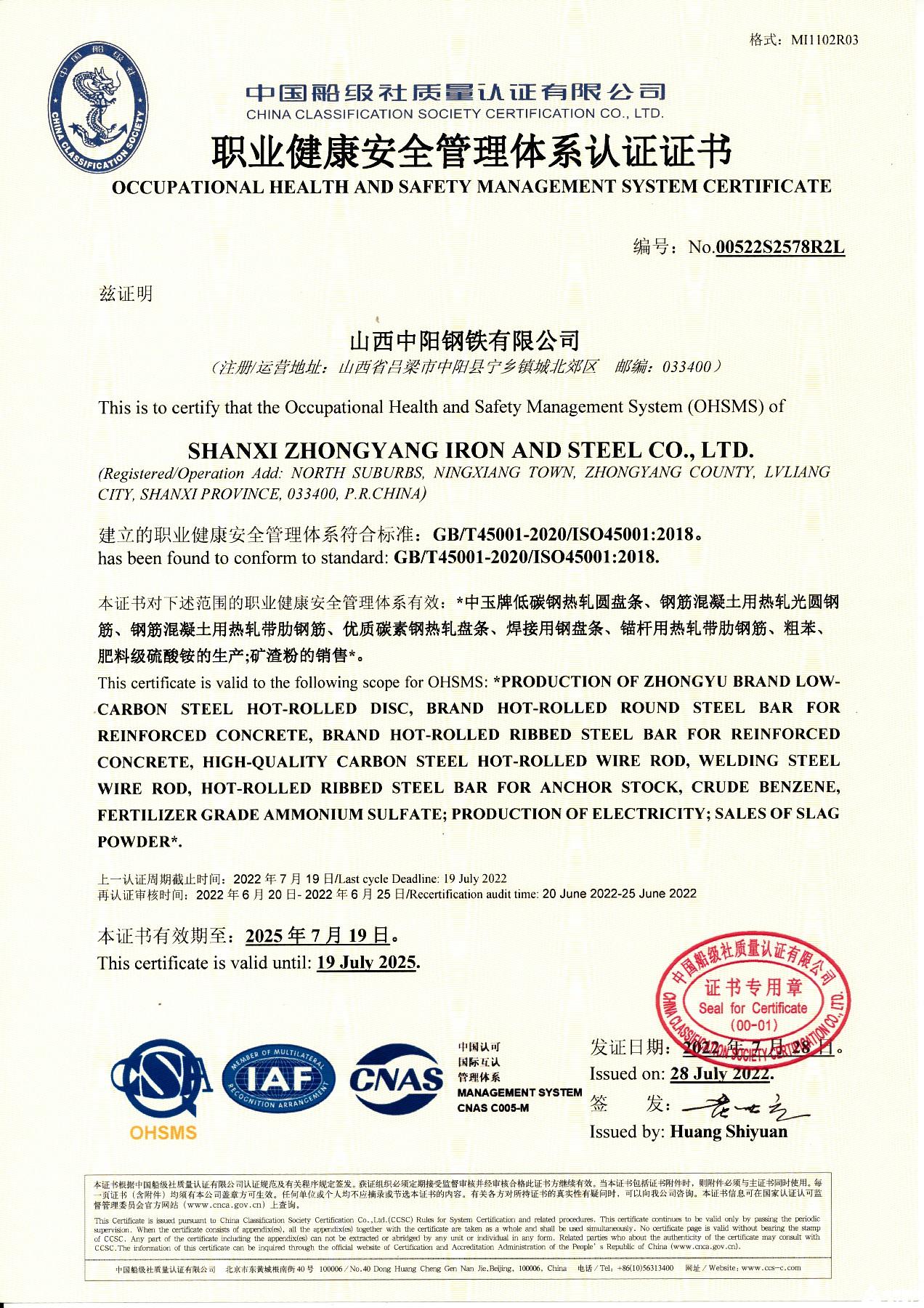 職業(yè)健康安全管理體系認(rèn)證證書